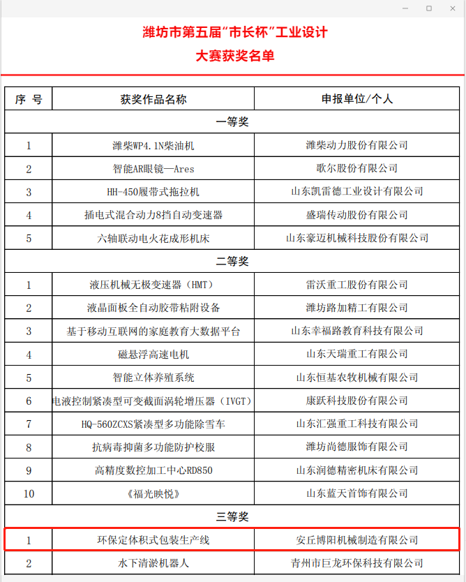 根據(jù)《濰坊市人民政府辦公室關(guān)于印發(fā)濰坊市第五屆“市長杯”工業(yè)設(shè)計大賽工作方案的通知》(濰政辦字〔2020〕52號)要求,經(jīng)專家組嚴(yán)格評審和網(wǎng)上公示,并經(jīng)市政府同意,安丘博陽機械“環(huán)保定體積式噸袋包裝機”被授予第五屆“市長杯”工業(yè)設(shè)計大賽三等獎,特此祝賀。